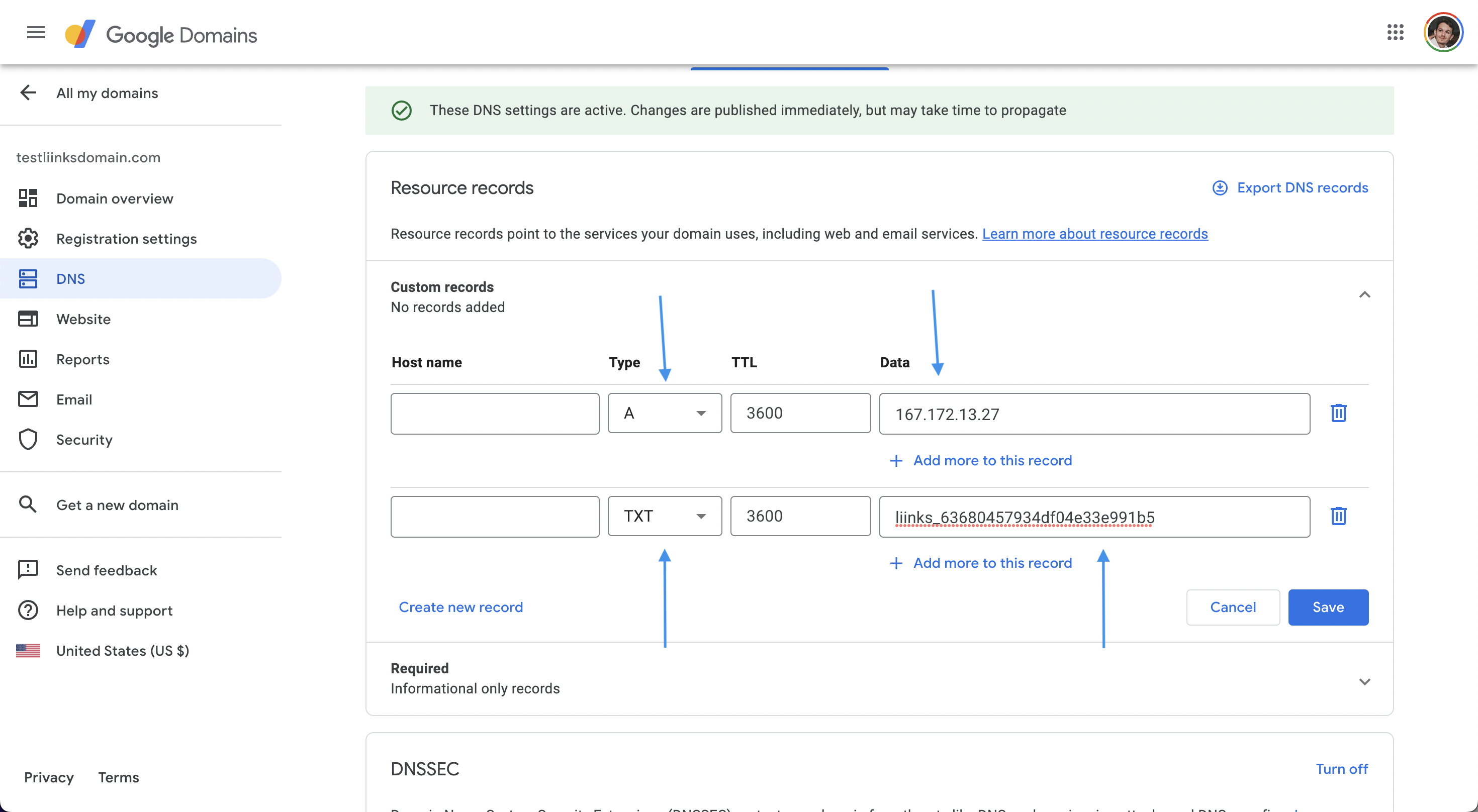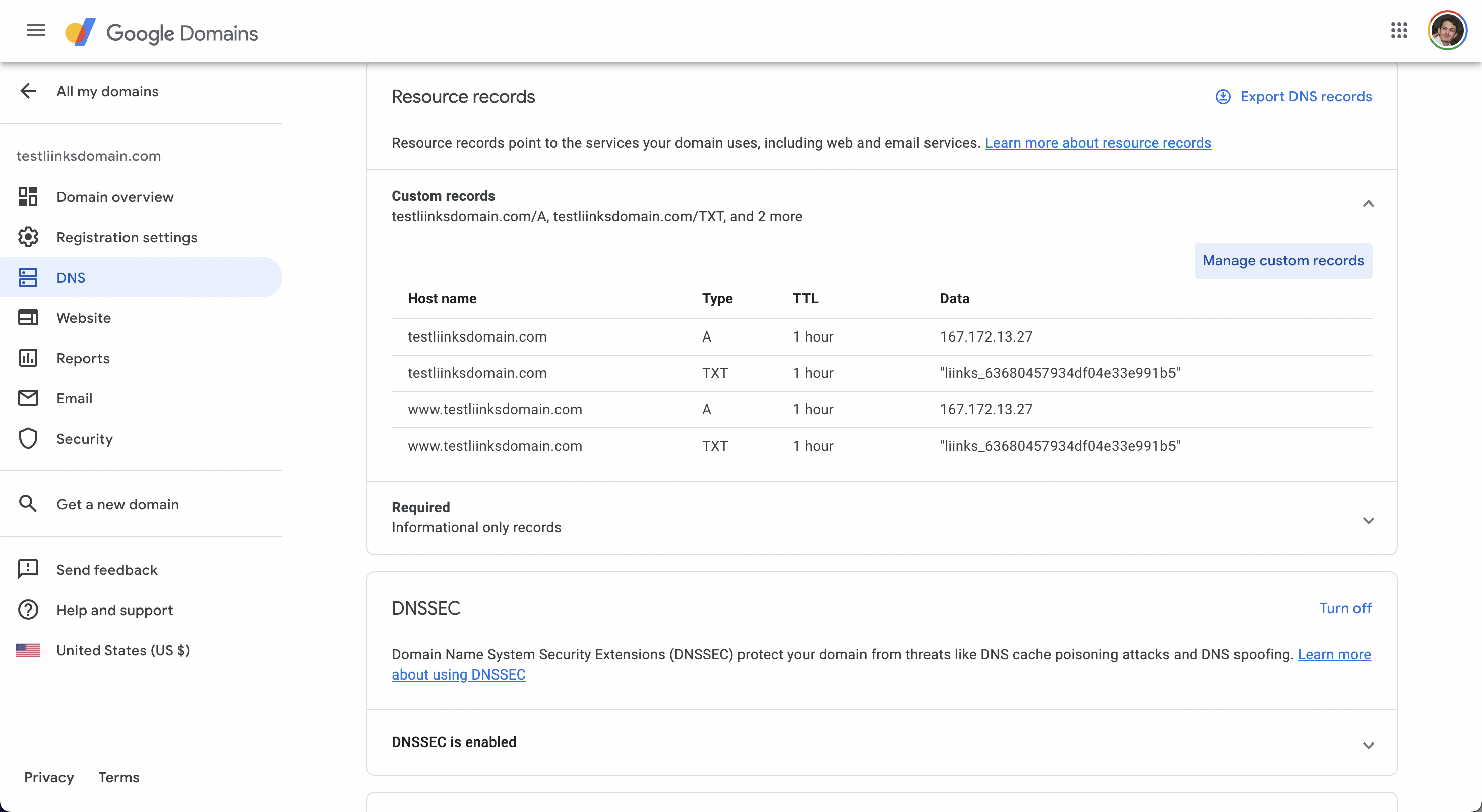 - One TXT record with the value provided in the Popup (something like liinks_123123123123123)