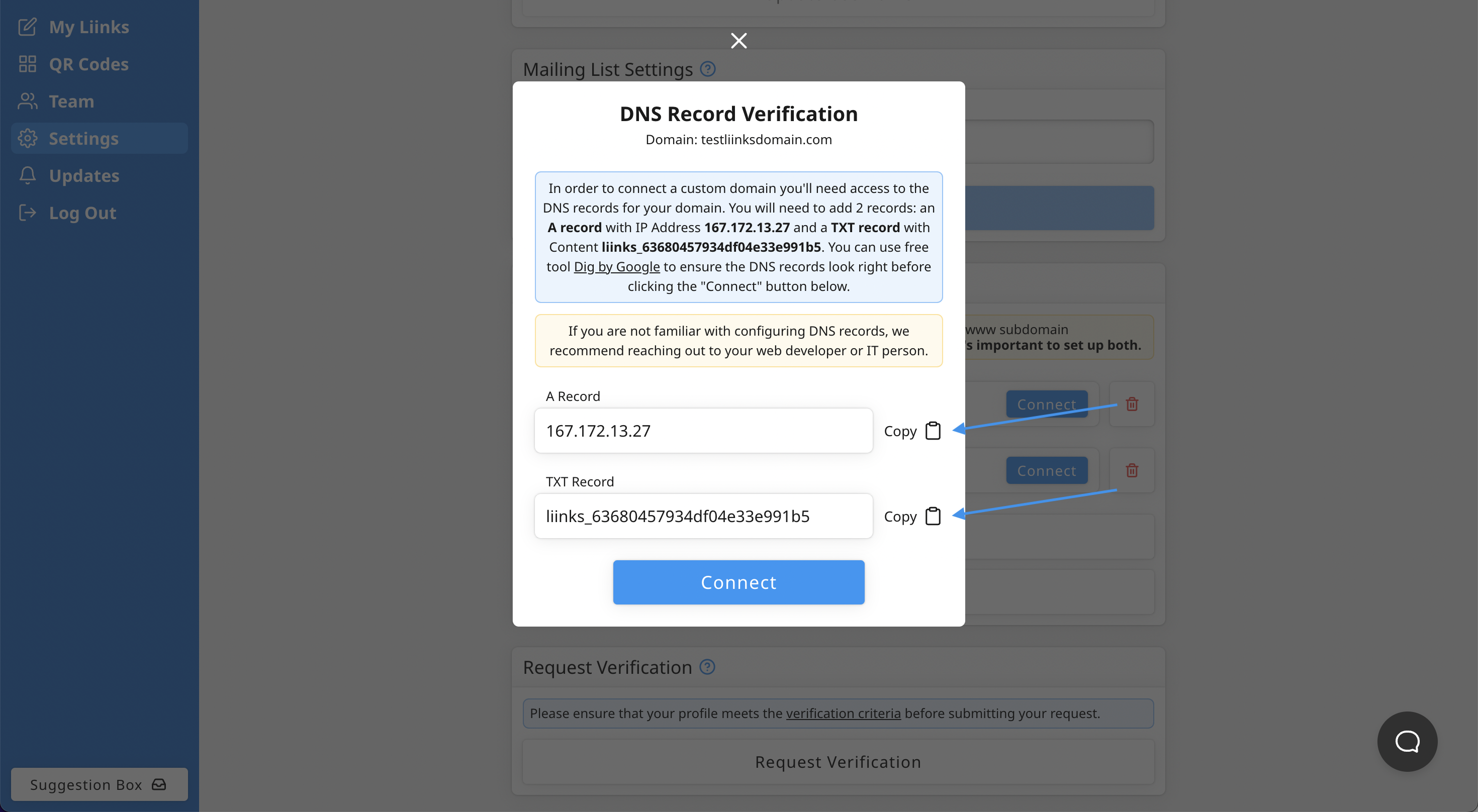 8) Once you've added and saved your records, you can use DIG to check that they've been added correctly. If the records were added correctly, hit the Connect button back in your Settings tab on Liinks.