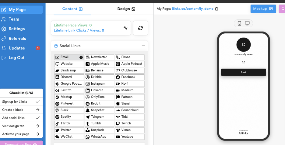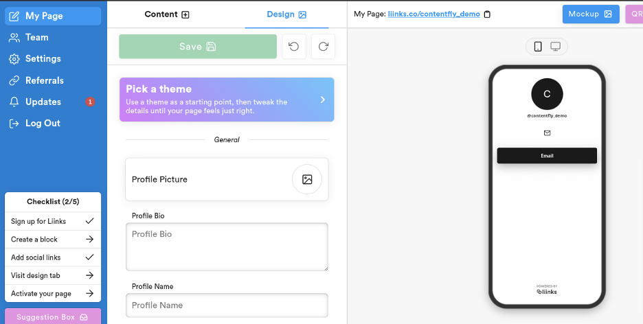 By clicking the “Design” tab, you can update the look and feel of your page. Click on “Pick a theme” to access a wide range of themes to suit any personality or purpose. Once you’ve selected a theme, click on “Profile Picture to upload a headshot of yourself. Then, be sure to fill in the Profile Bio and “Profile Name” before you click “Save.”