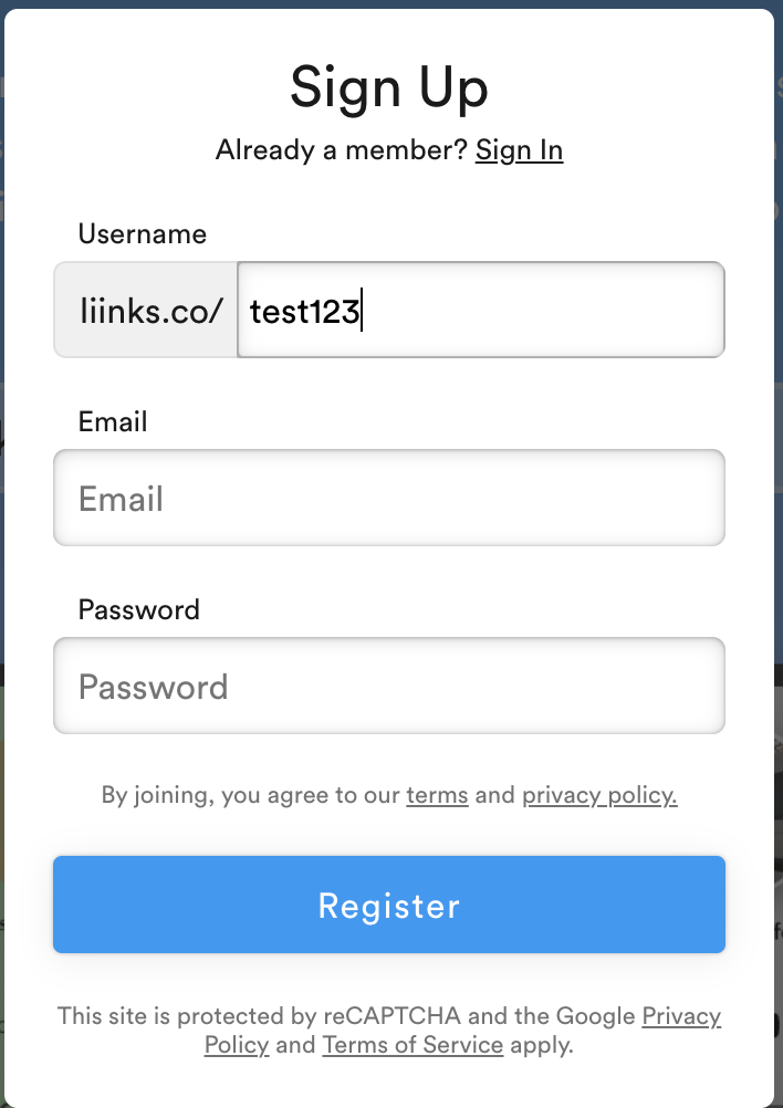 Creating your Liinks account is quick and easy. You can do this from the homepage. In the top right, you can click “Sign Up” or type your desired user name into the bar in the center of the page.